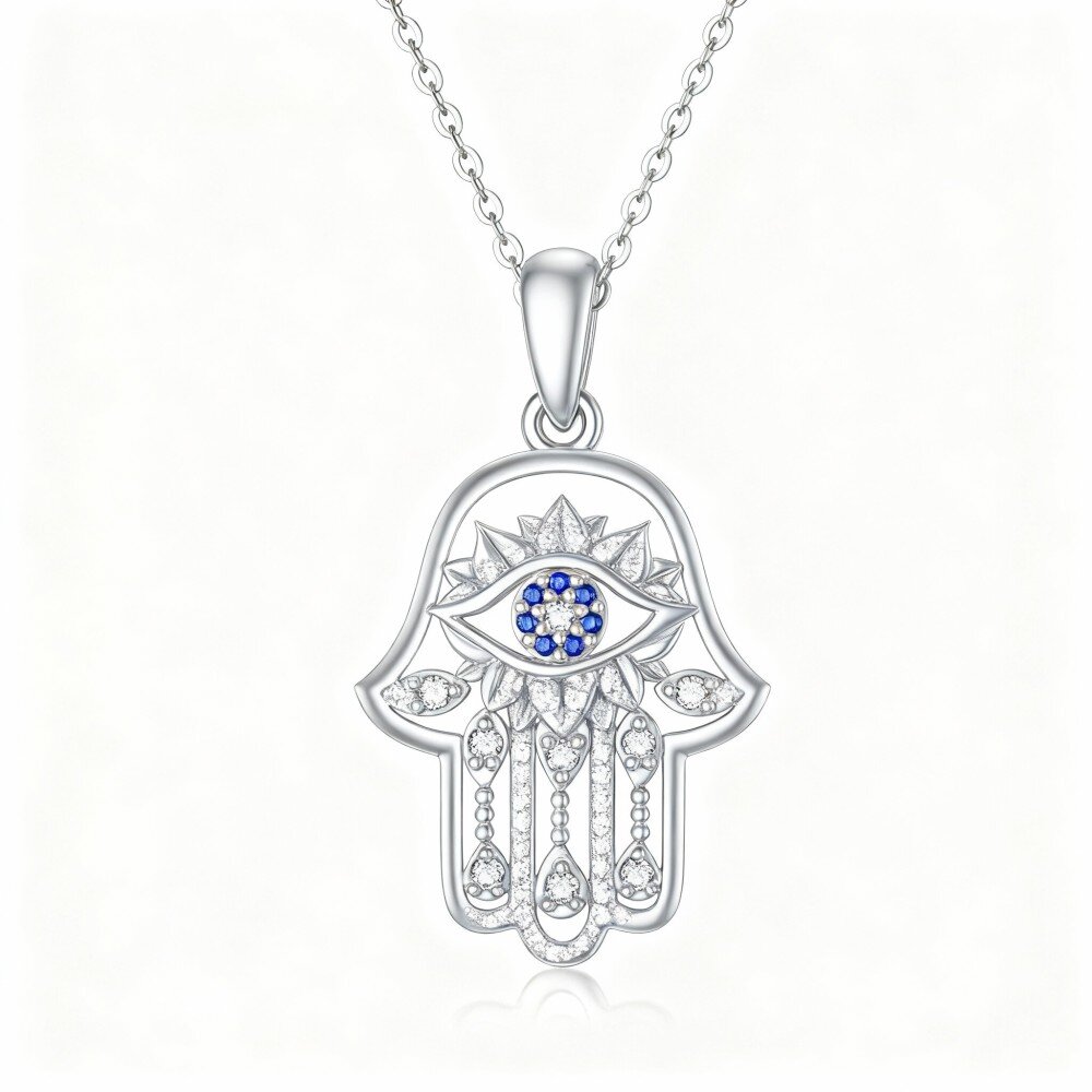 اكتشفي الجمال الساحر لقلادة من ال10K الذهب ابيض بتصميمات العين الشريرة واليد الحامسة، وهي مثالية لمن يبحثن عن الأناقة والحماية.
