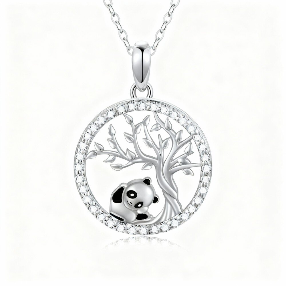اختبر سحر قلادةنا المصنوعة من ال10K الذهب ابيض كيلو، والتي تزدان بحجر مويسانيت مذهل مصمم بشكل جميل على شكل باندا وشجرة الحياة.