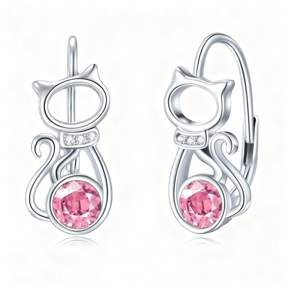 اكتشفي أناقة أقراطنا المصنوعة من الذهب ابيض عيار 14 قيراط والمزودة بمشبك خلف الأذن، والتي تتميز بتصميم قطة غريب الأطوار مزين بكريستالات وردية لامعة.