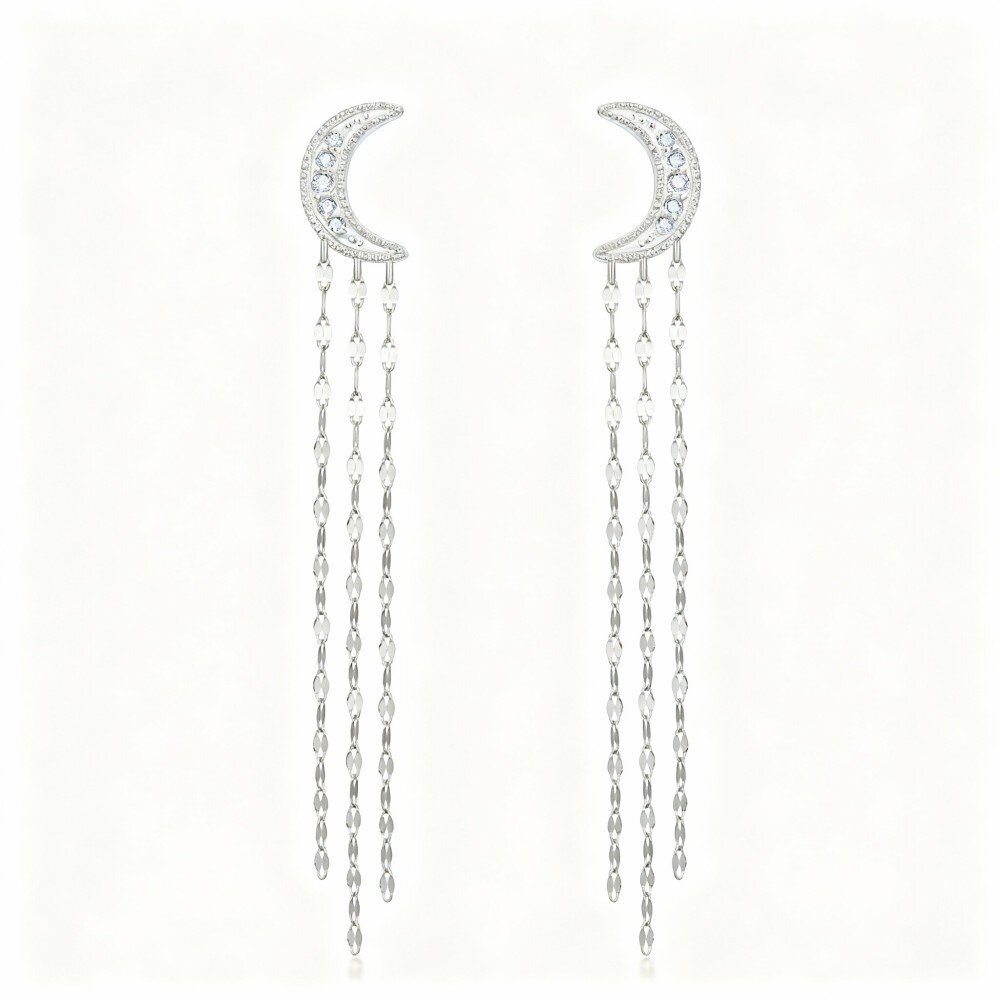 عززي جمالك مع أقراطنا المذهلة من ال10K الذهب ابيض على شكل قطرات القمر، والتي تتميز بأحجار المويزانيت اللامعة وتصميم القمر الأنيق.