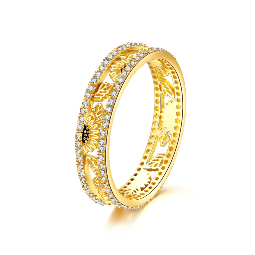 خاتمنا الجميل على شكل زهرة عباد الشمس مصنوع من الذهب عيار 10 قيراط ومرصع بزركونيا لامعة، وهو مثالي لإضفاء الأناقة على أي مظهر.